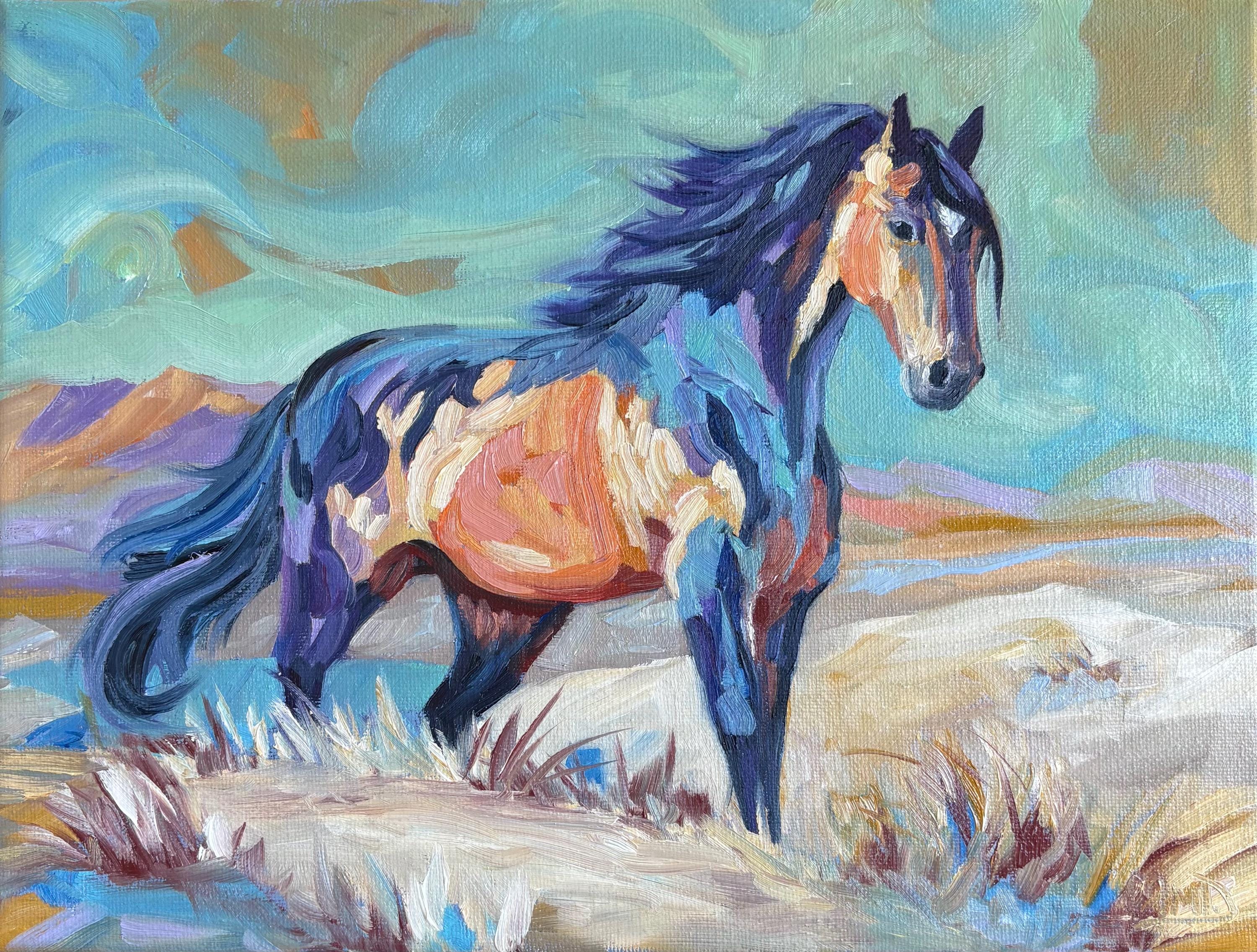This equine study blends bold color with elegant form, making it a striking piece for horse lovers and Western art enthusiasts.
