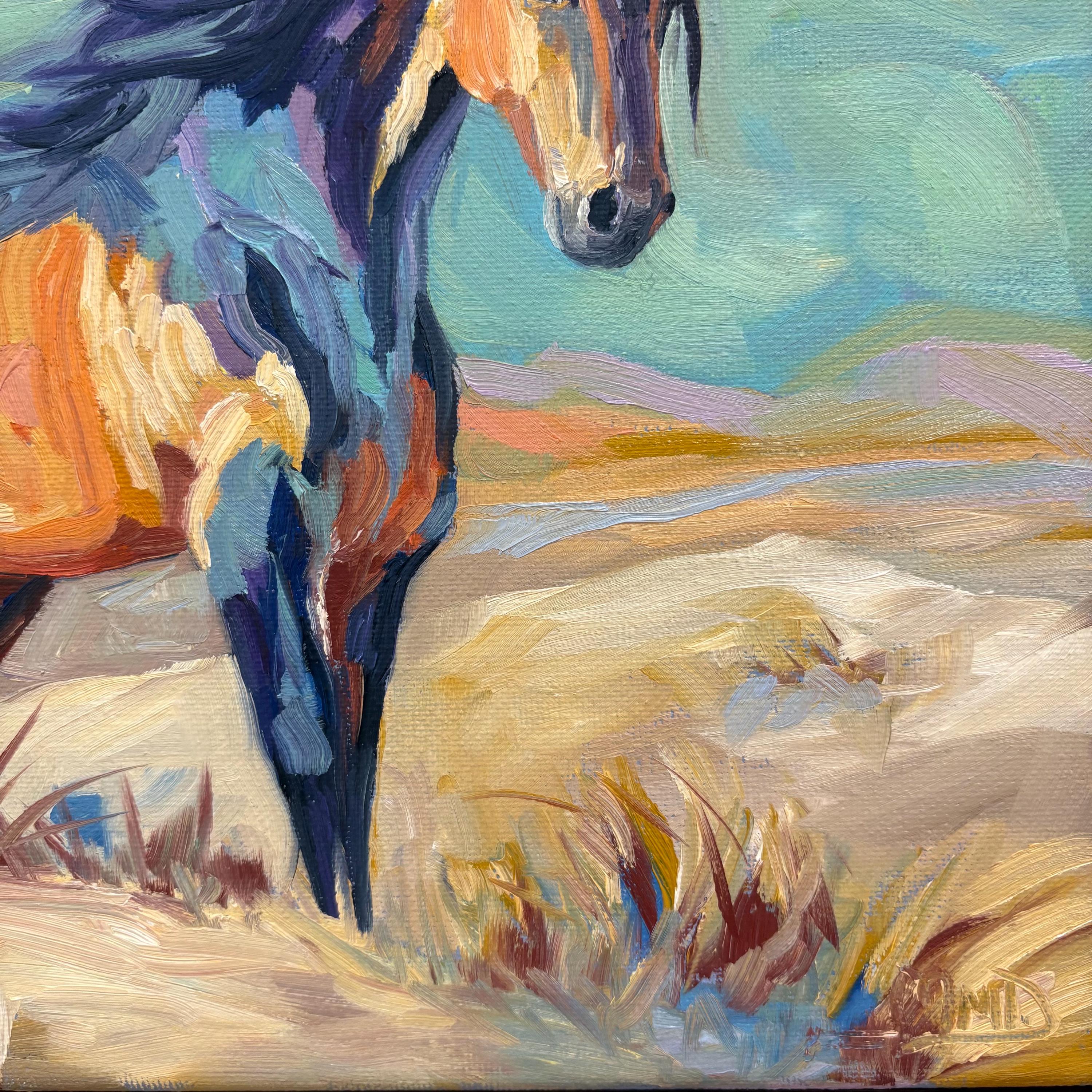 Painted in oil on a 9x12 inch stretched canvas with ¾-inch depth, this equine study blends bold color with elegant form, making it a striking piece for horse lovers, Western art enthusiasts, and collectors of animal oil paintings.