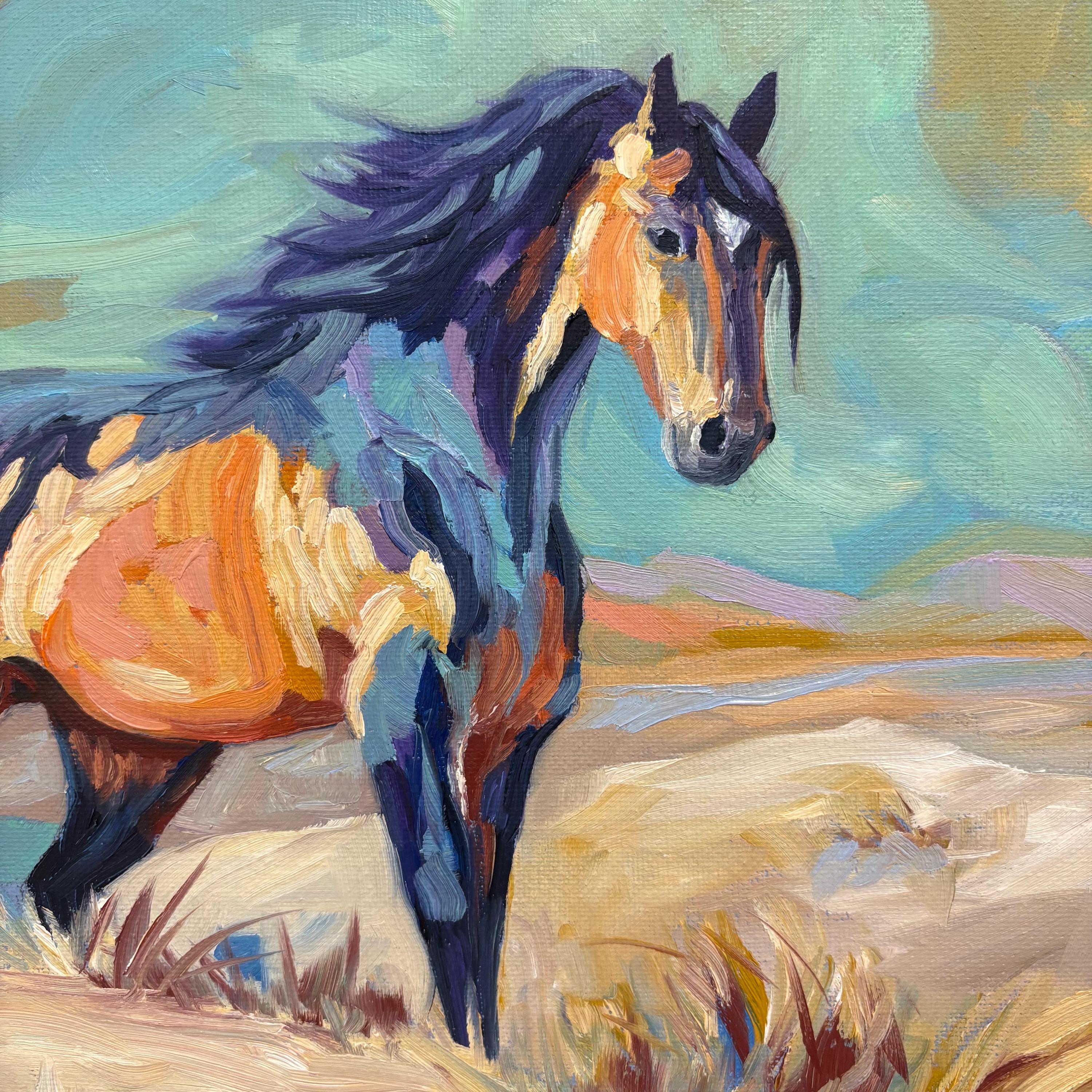 This original colorful horse painting by Melissa Maxwell Davis captures the strength and spirit of the horse in expressive, vibrant brushstrokes.