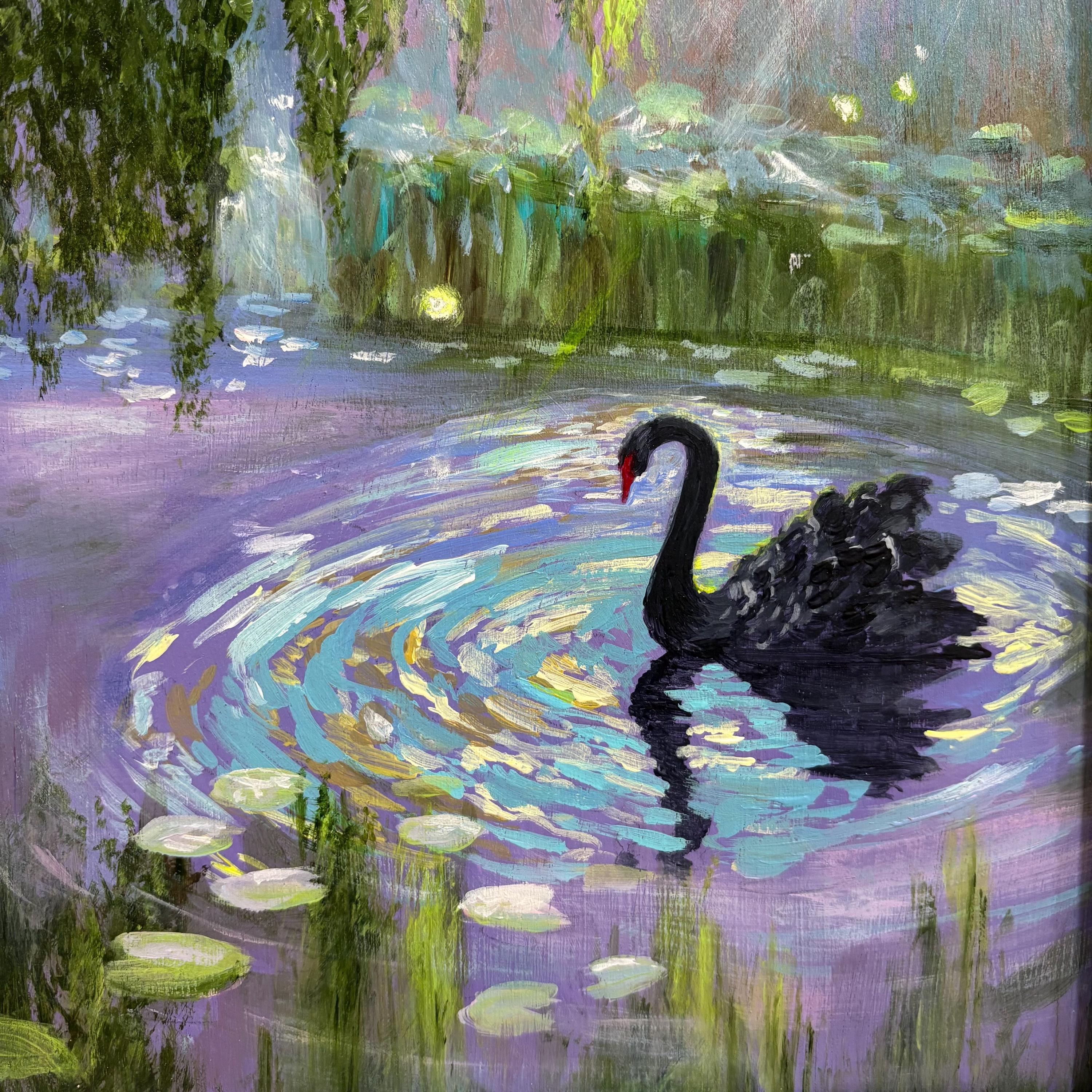 This original black swan acrylic painting by Melissa Maxwell Davis features a graceful swan gliding across a quiet pond beneath a flowing willow tree, creating a scene filled with elegance, calm, and natural beauty.